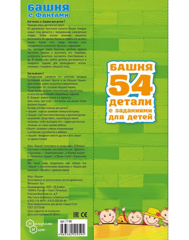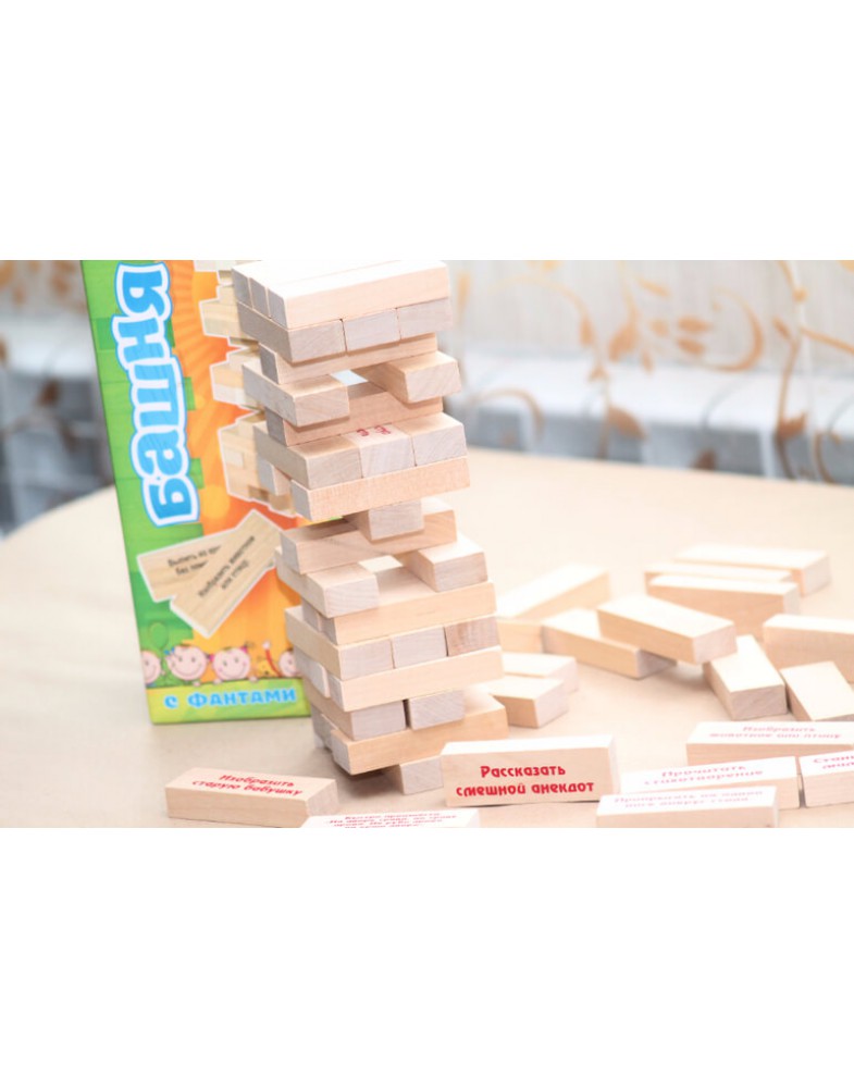 В этой башне детям надо будет внимательно смотреть на свои бруски. Если на каком-то оказалось задание, его надо будет выполнить, и только потом ставить свой брусок наверх. Задания бывают простые и сложные, смешные и творческие: