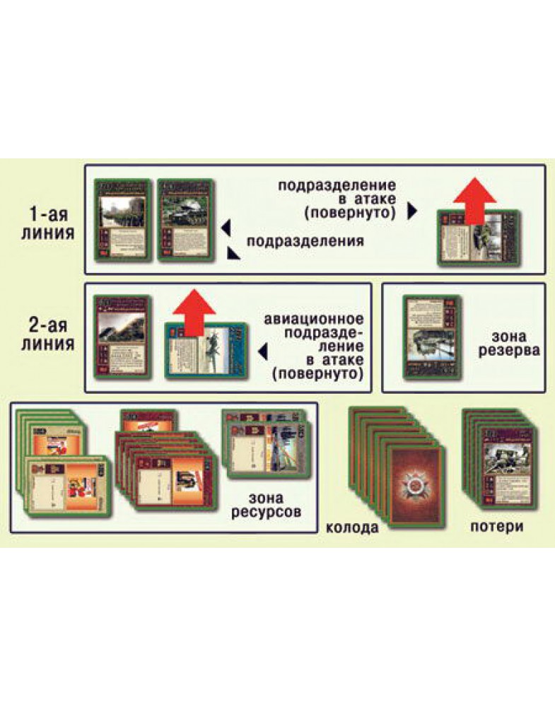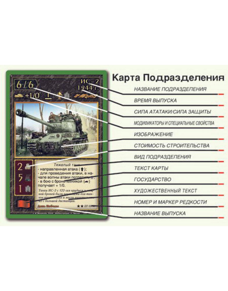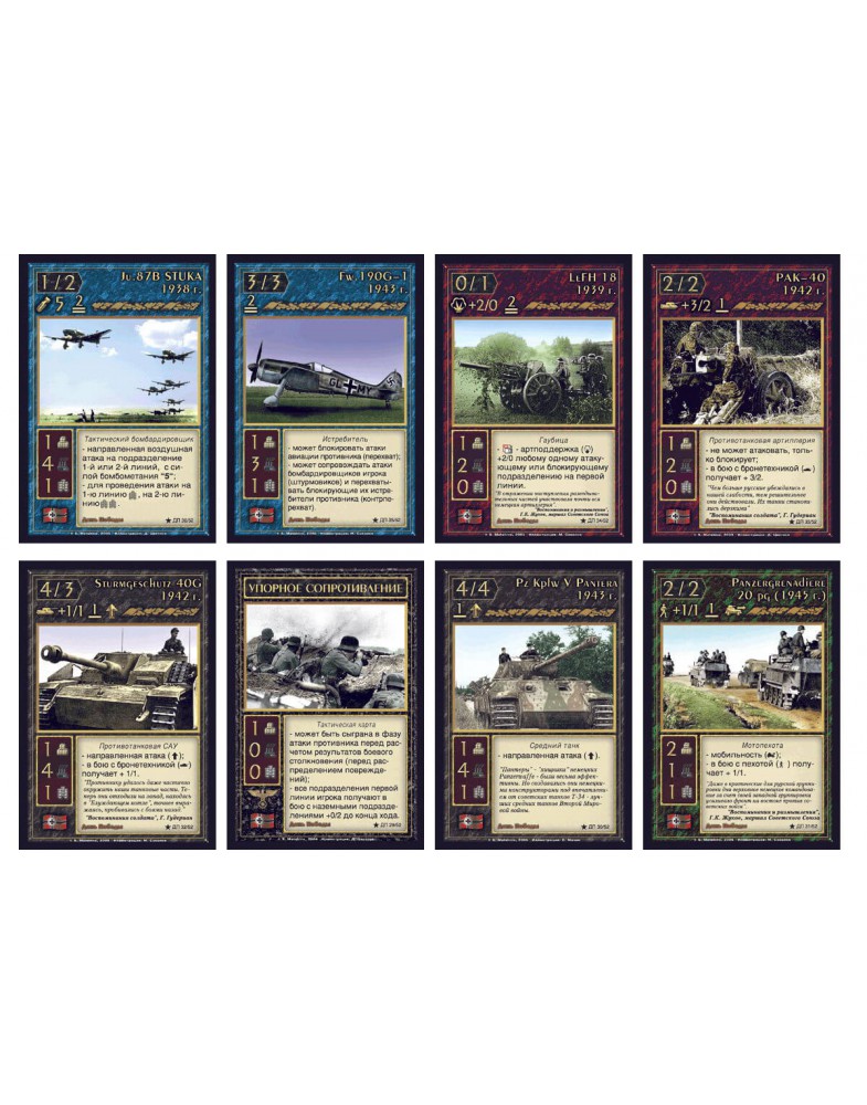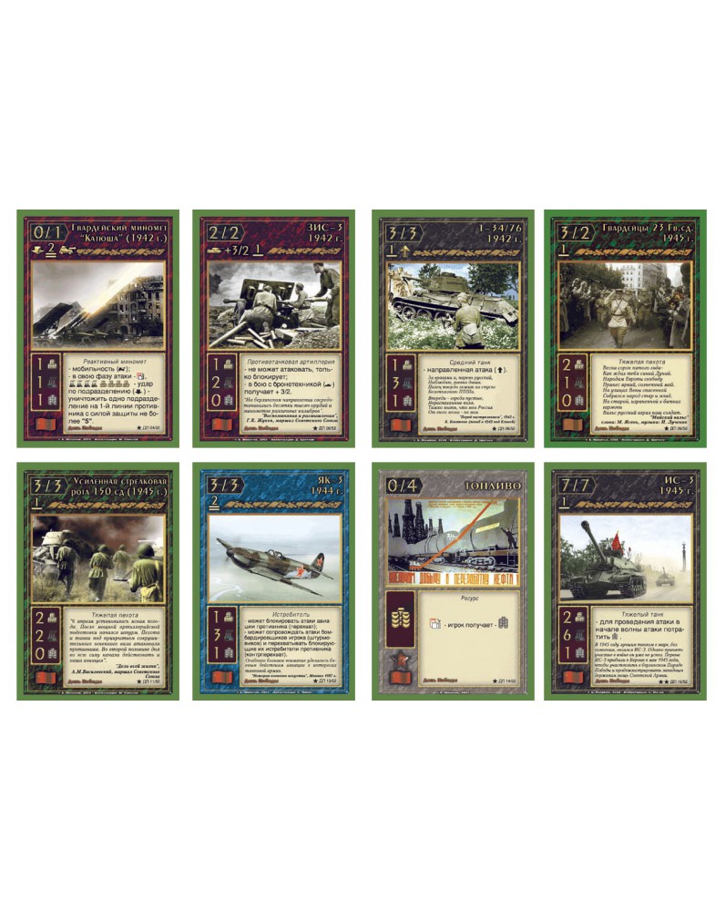 Карточная стратегическая игра День Победы посвящена взятию Берлина и разгрому немецких войск. Каждый из игроков выступает как командующий одной из дивизий. У него под командованием есть различные боевые подразделения: пехота, артиллерия, бронетехника и авиация. Каждое из подразделений описанных в этой игре имеет исторический аналог – например, в игре присутствуют стрелковые роты когда-то реально существовавших дивизий, а также взводы танков Т-34 и КВ, в том числе батареи реактивных минометов «Катюша», ну и эскадрильи самолетов ТУ-2 и Ла-7 и т.д. Здесь при помощи специальных «тактических карт» становятся реальными различные тактические приемы, особенности боевых столкновений, психологические эффекты. По ходу игры участники моделируют различные боевые действия дивизий: авиационные бомбардировки и проведение артподдержки, атаки и прорывы, блокирование вражеских войск и организация обороны.
