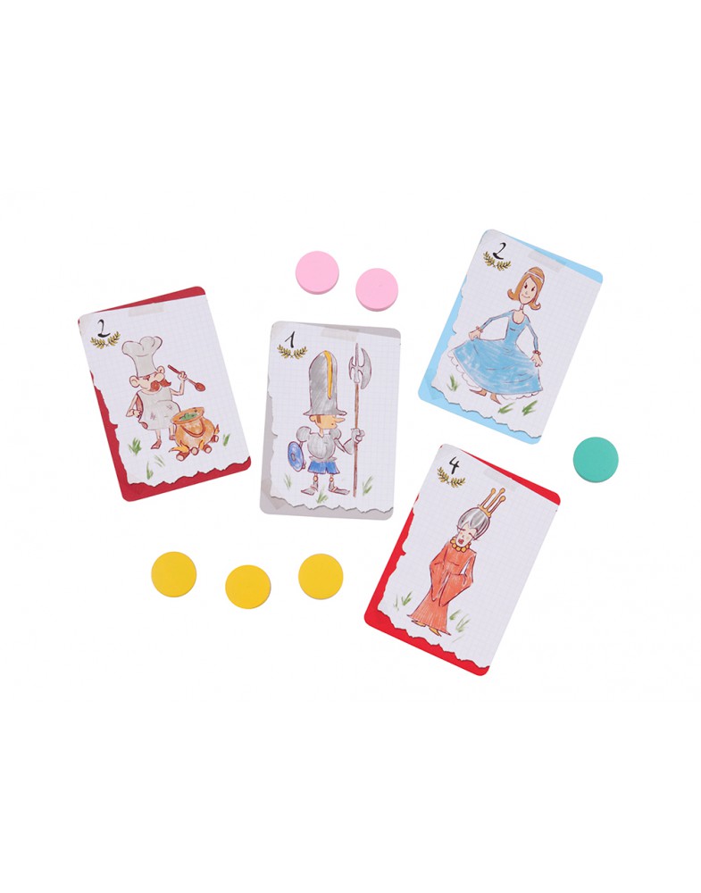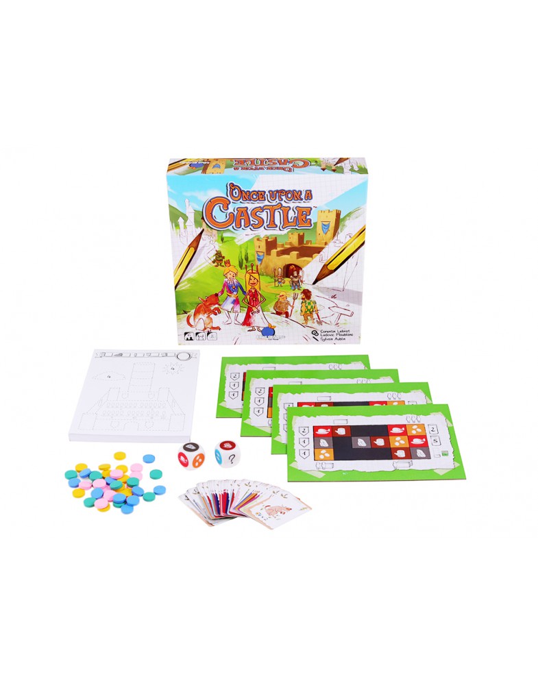 В состав настольной игр Однажды в замке (Once upon a castle) входят: блокнот «замков» с двусторонними листами, 4 набора по 10 цветных фишек, 4 двусторонних планшета, 2 кубика, 36 карт гостей, правила игры.