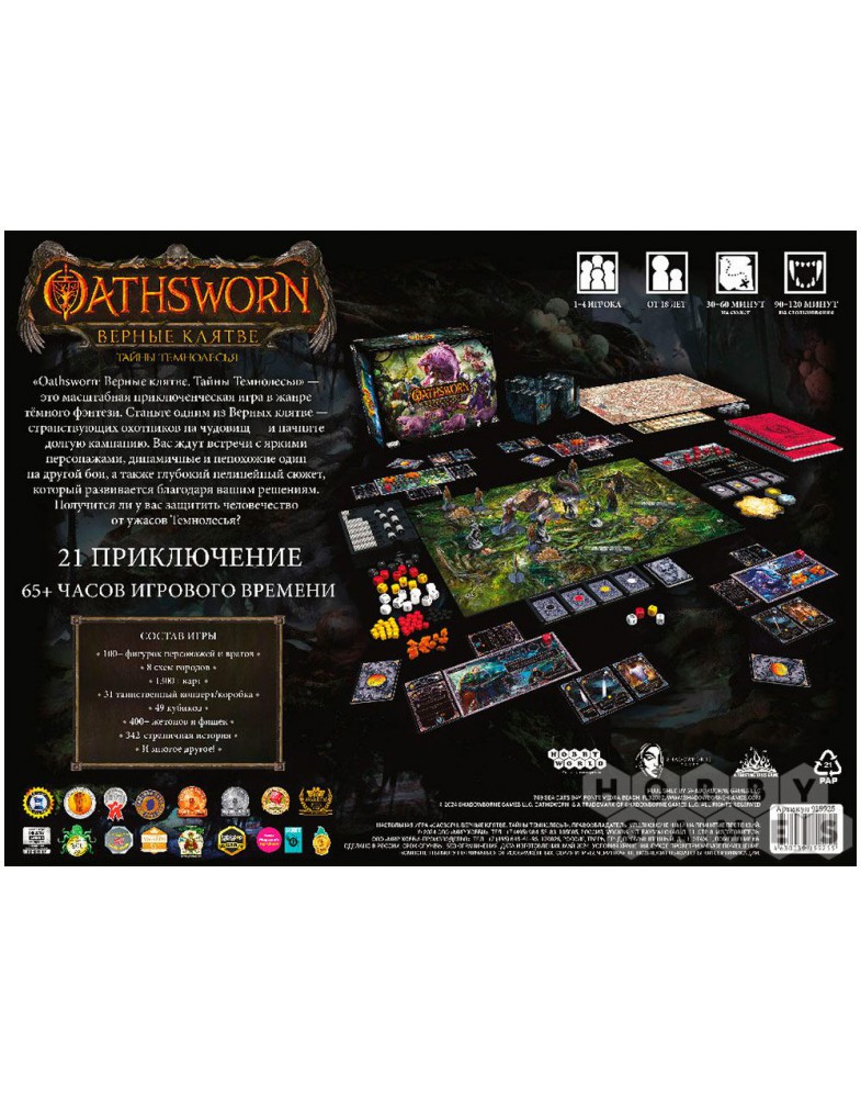 "Oathsworn: Верные клятве. Тайны Темнолесья" – это интерактивная настольная игра в жанре тёмного фэнтези. Вы станете вольнонаёмниками, которые отправятся в путешествие по когда-то великим землям, теперь поглощённым разрушительным Темнолесьем. Вы будете сражаться с врагами, сидеть над головоломками и взаимодействовать с таинственными предметами из реального мира. "Тайны Темнолесья" – это кампания, объединённая серией приключений, каждое из которых состоит из двух частей. Решения, которые вы будете принимать на своём пути, непосредственно влияют на исход ваших странствий. Динамичные бои, нелинейный сюжет, прописанный мир и уйма приключений – всё это и есть "Oathsworn: Верные клятве. Тайны Темнолесья".