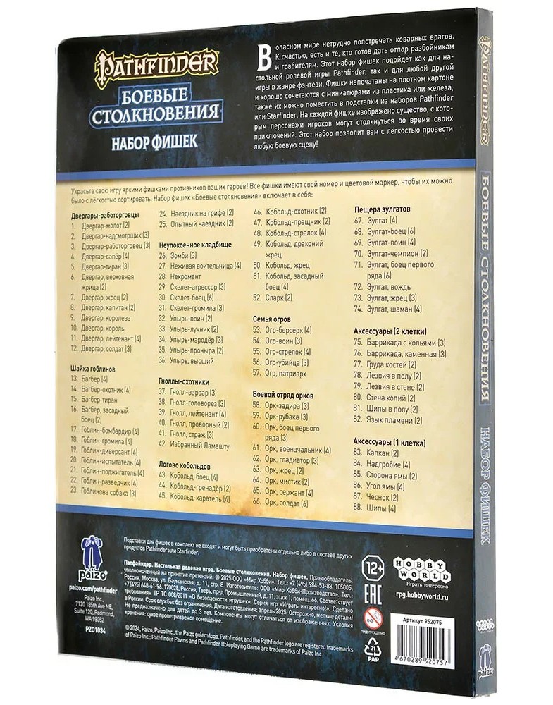 Быть авантюристом в мире без вызовов – скука смертная. Максимум, что светит – посиделки в таверне, после которых придётся прокидывать ловкость на прохождение сквозь двери. Как здорово, что в мире Pathfinder есть и надоедливые гоблины, и суровые двергары, и сухонькие некроманты, которым так и хочется пожать горло. В этом наборе таких вот негодяев больше двух сотен (это как минимум по сотне на каждую руку вашего авантюриста). Да ещё и разные препятствия: колья, лезвия, шипы, пламя, ямы, капканы... В общем, если вы жаждете острых ощущений и славных битв, смело берите набор фишек "Боевые столкновения". Все злодеи заботливо напечатаны на плотном картоне, а потому будут отлично смотреться на игровом поле и долго радовать глаз, а ещё сделают ваши партии более наглядными и яркими.