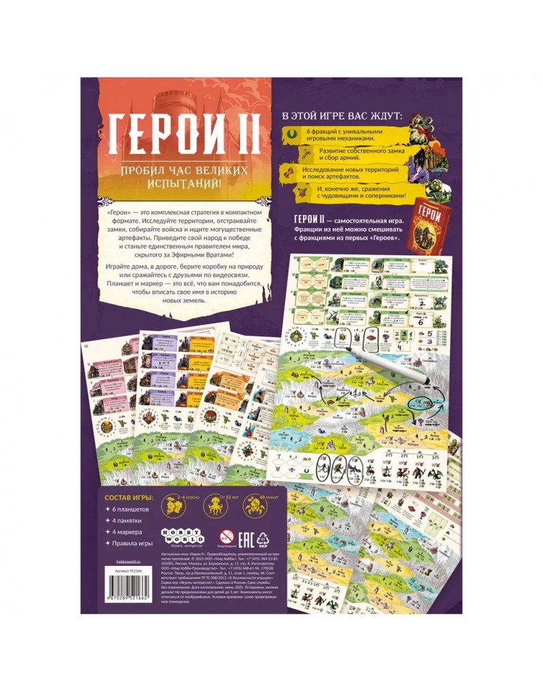 "Герои II" – это масштабная приключенческая стратегия в компактном формате. Вам больше не понадобится искать свободное место для поля или раскладывать кучу компонентов ради одной партии – достаточно просто взять планшет и маркер из коробки. Выберите и возглавьте одну из шести уникальных фракций и сделайте всё возможное, чтобы привести свой народ к победе. Вы будете возводить замки, собирать армии, исследовать неизведанные земли, искать артефакты, сражаться с чудовищами и соперниками. Каждый шаг будет приближать вас к заветной цели, но лишь один герой сможет стать повелителем мира за Эфирными Вратами! Удобный формат игры позволит устроить фэнтезийные баталии где угодно: дома, в дороге, на природе или даже по видеосвязи, за сотни километров друг от друга. А ещё вторых "Героев" можно скомбинировать с предыдущей игрой серии, чтобы устроить поистине грандиозное приключение!