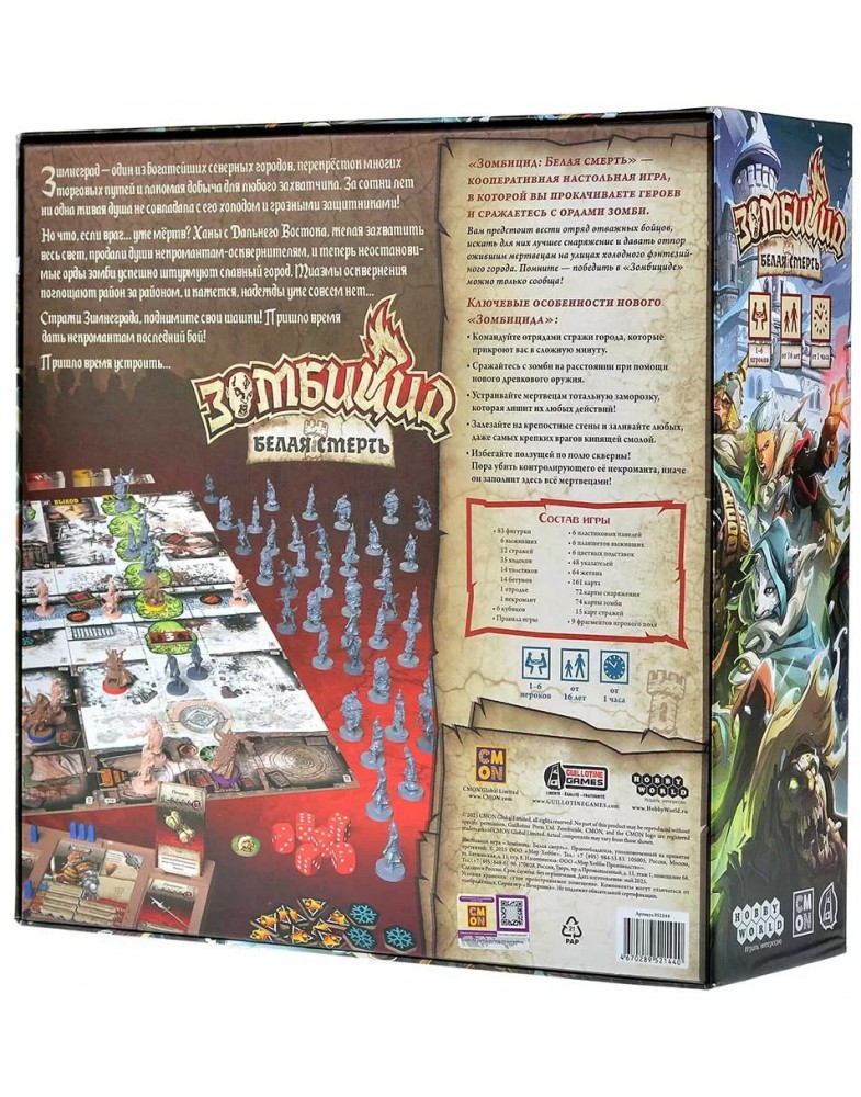 Дайте отпор полчищам голодных мертвецов в этой обжигающе-холодной версии культовой кооперативной настолки "Зомбицид"! На этот раз полем битвы станут покрытые льдом и снегом улицы фэнтезийного Зимнеграда. Возглавьте команду отважных героев, как следует прокачайте их навыки и вооружитесь новым оружием ледяной войны, чтобы нанести смертельный удар тёмному некроманту и остановить распространение ползучей скверны. Боевой арсенал игроков стал ещё обширнее и разнообразнее – теперь армии зомби можно атаковать издалека при помощи древкового оружия, обливать кипящей смолой с крепостных стен, сталкивать с отрядами городской стражи и даже подвергнуть их тотальной заморозке! Но помните – только вместе вы сможете одолеть тёмные силы и вернуть Зимнеграду мир и покой.