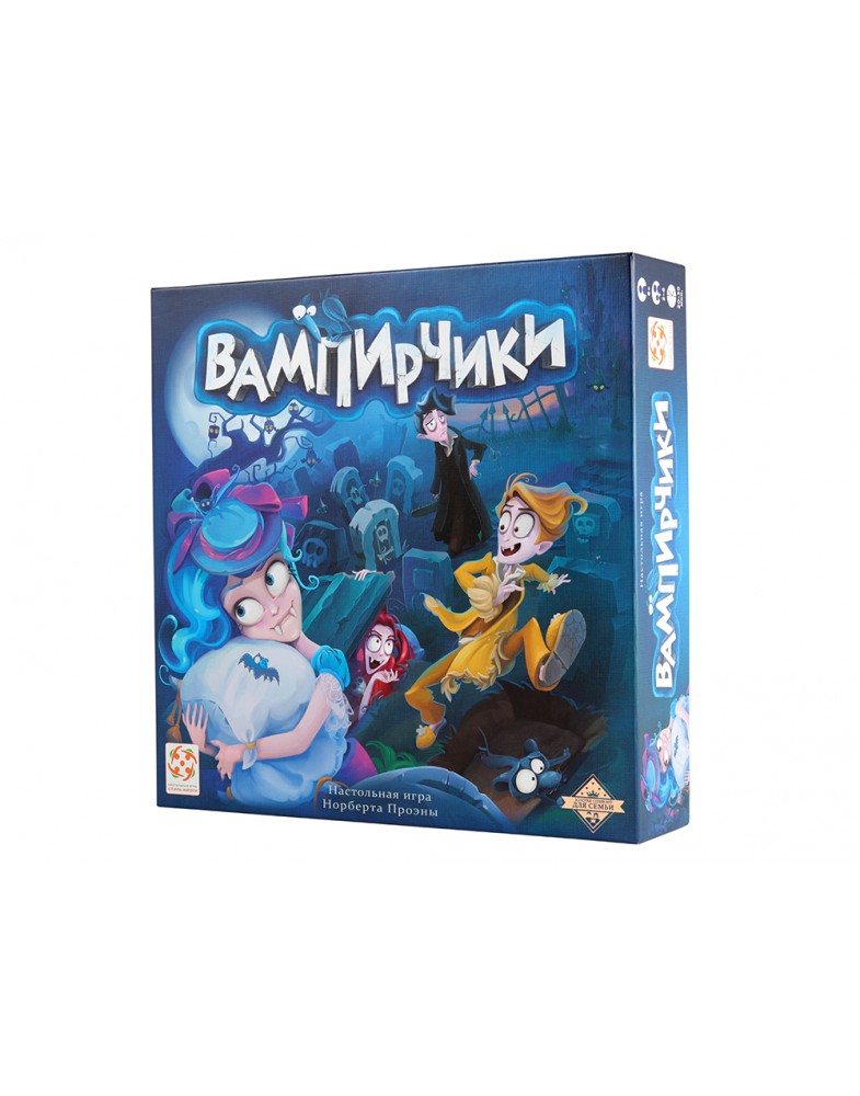 В настольной игре Вампирчики 60 забавных вампирчиков 6 цветов. До того, как первые лучи солнца коснутся земли, им необходимо спрятаться на кладбище… На игровом поле изображены 60 могил, на которые в случайном порядке раскладываются крышки (с обратной стороны они цветные). Задача каждого игрока – избавиться от всех своих вампирчиков, разместив их в могилах с соответствующими по цвету крышками. В свой ход игрок открывает одну из могил – если она пустая и цвет её крышки совпадает с цветом одного из крайних вампиров в его ряду, то игрок может положить его в эту могилу. Так продолжается до тех пор, пока он не откроет могилу с крышкой ненужного ему цвета или (что намного хуже) занятую. В таком случае ему придётся в качестве наказания взять деревянный колышек (а когда таких колышков у него накопится 3, другие игроки будут просто счастливы отдать ему по одному вампиру в качестве «подарка»!) Кроме того, у каждого игрока есть по 3 связки чеснока, которые он может класть в могилы, чтобы вампирчики других игроков не смогли их занять. Таким образом, если кому-то из участников уже не так далеко до победы, можно слегка напакостить, положив чеснок в могилу с крышкой нужного ему цвета! :)