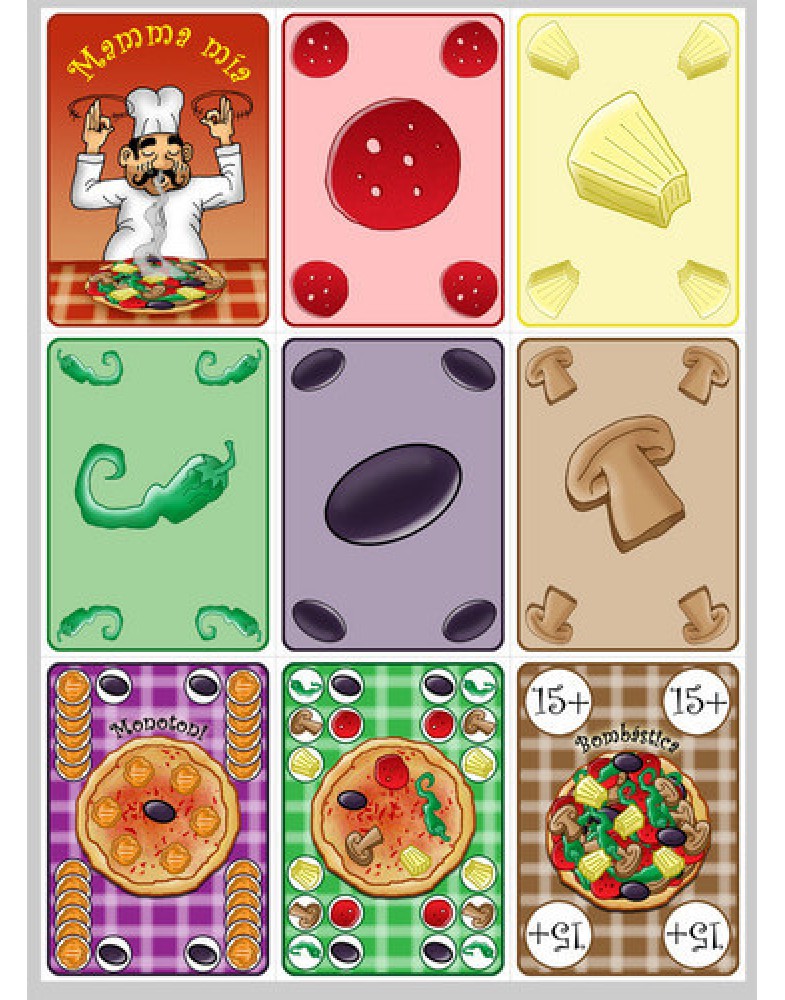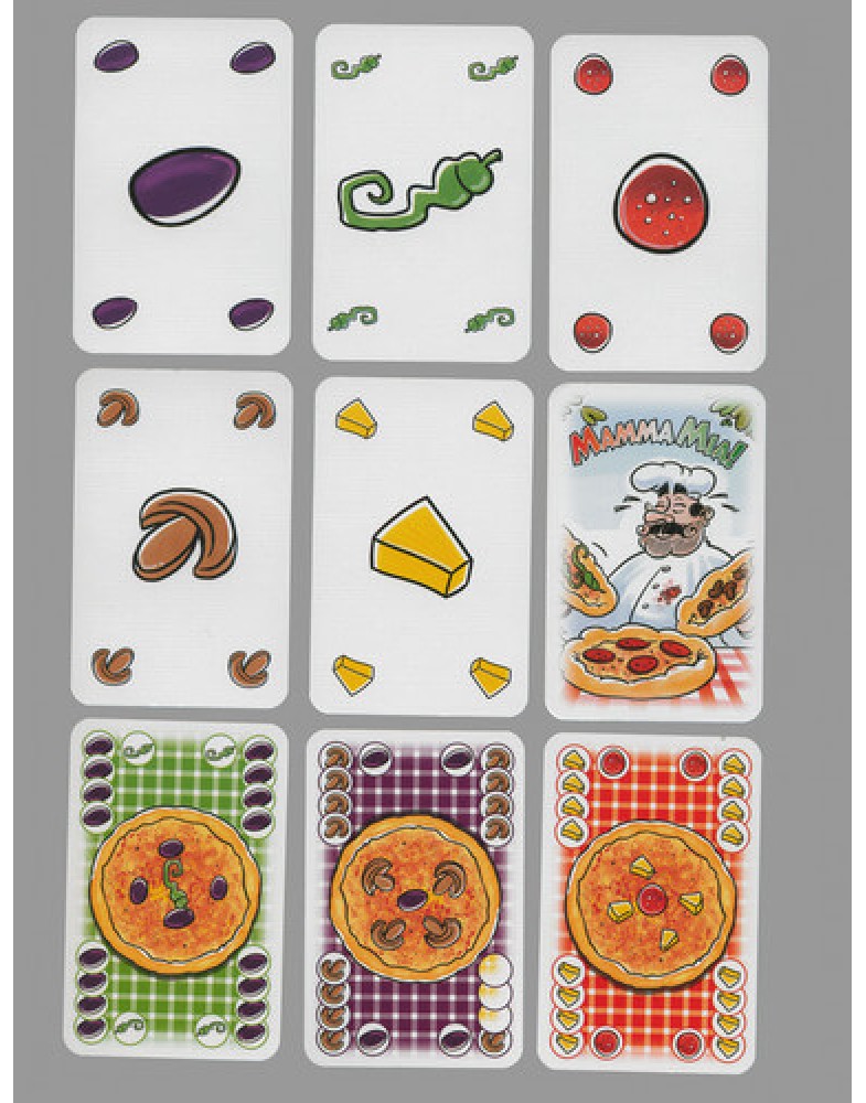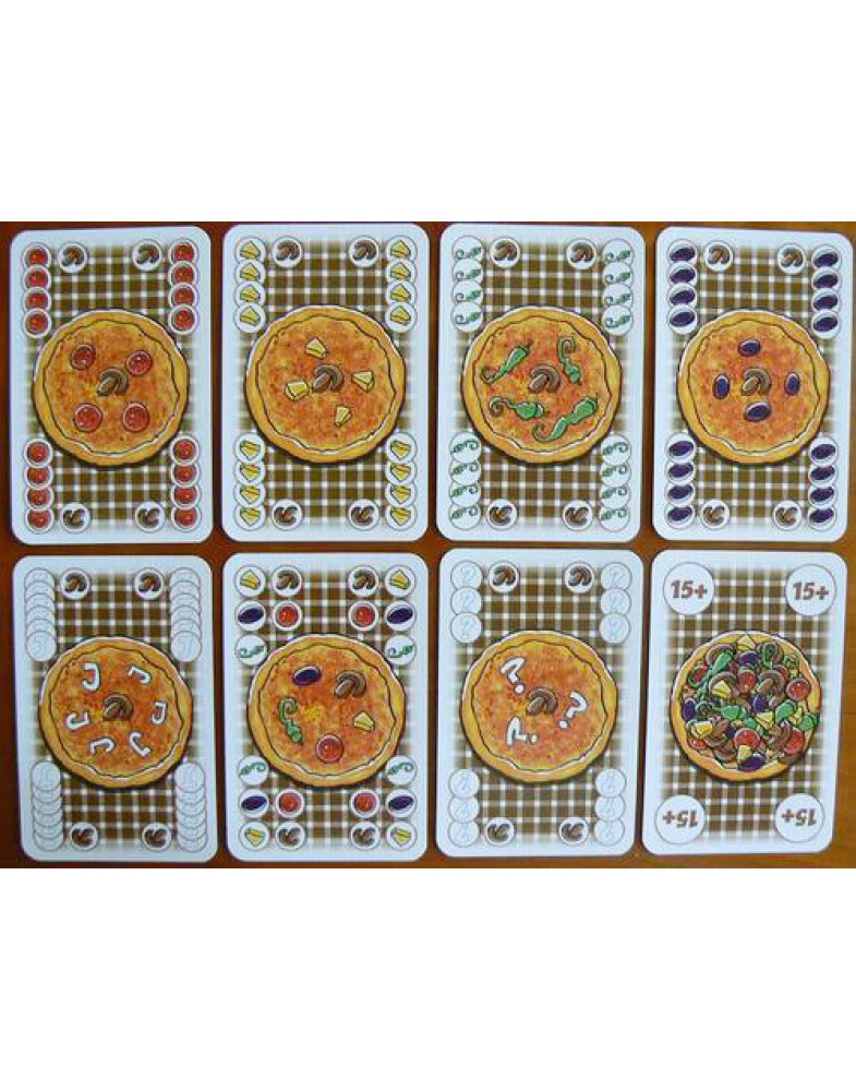 В руке у каждого игрока несколько карт ингредиентов для приготовления пиццы (перец, ананас, грибы, салями и оливки), а также одна или несколько карт заказов на пиццу. На картах заказов изображено из каких ингредиентов готовится эта пицца. Каждый игрок в свой ход кладет в стопку сброса под названием “печь” одну или несколько карт игредиентов, причем, если кладет несколько, то это должны быть одинаковые ингредиенты. После, если он считает, что в печи на данный момент достаточно ингредиентов для приготовления пиццы, изображенной на одной из карт заказа, он может положить в печь заказ. В конце хода игрок пополняет руку за счет общей колоды ингредиентов или персональной колоды заказов.